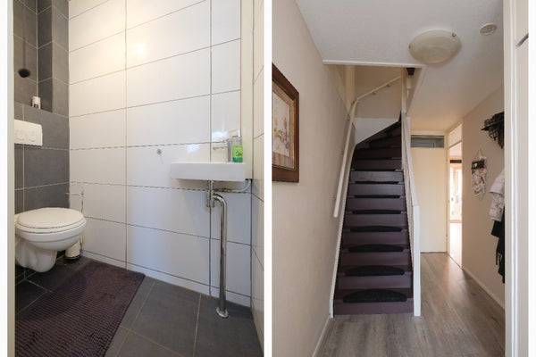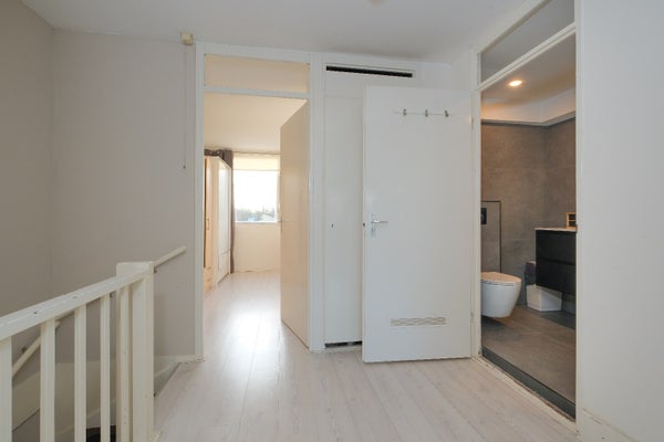 Trapopgang naar de overloop van de tweede verdieping. Hier vind je 3 de ruime slaapkamers waarvan 1 slaapkamer met een wastafel en een airco (2022). Badkamer is nieuw (2022), modern ingericht met een inloopdouche, wastafelmeubel met spiegel, designradiator en hangtoilet. Op deze verdieping ligt een nette laminaatvloer.