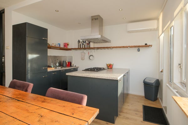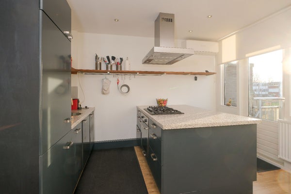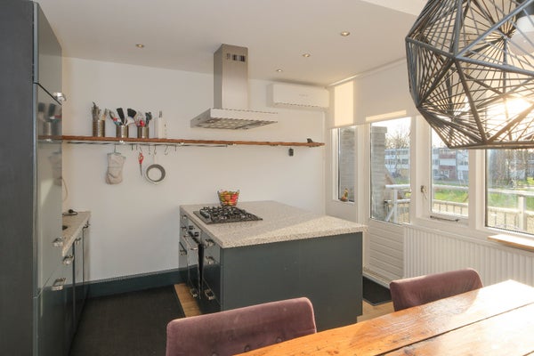 Aan de achterzijde van de woning een gezellige keuken met kookeiland met aangrenzend een balkon perfect voor een kopje koffie in de ochtendzon. De keuken biedt voldoende werkruimte en sluit mooi aan op de ruime eethoek, waardoor koken en tafelen een fijne sociale beleving wordt.