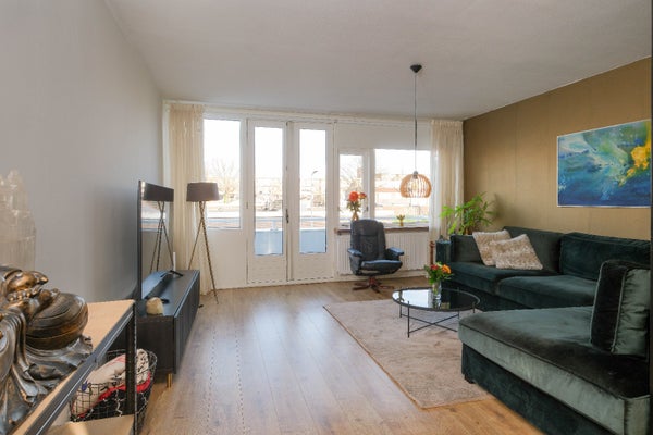 Toegang naar de ruime woonkamer waar voldoende plaats is voor een royale zithoekbank. Mooi vrij uitzicht met aan de voorzijde openslaande tuindeuren met toegang naar het balkon.