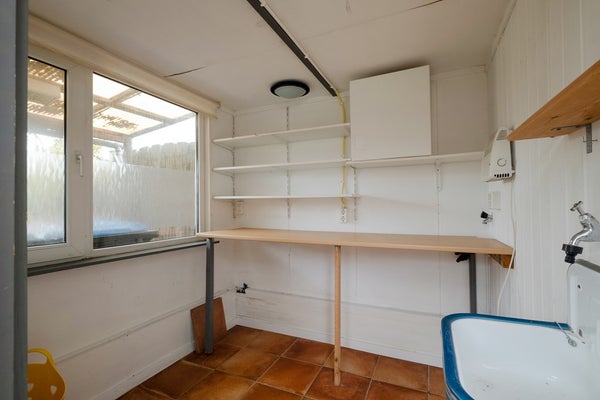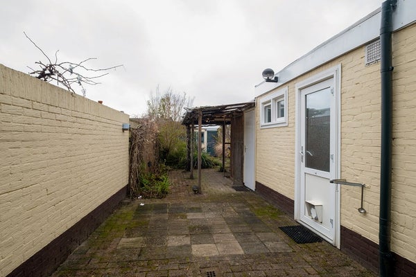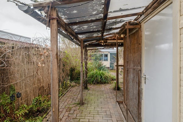 De ruime achtertuin is bereikbaar via een achterom. Hier geniet je van zon en privacy. De vrijstaande berging biedt ruimte voor fietsen en opslag — of zoals wij zeggen: een perfecte plek voor een man cave, hobbyruimte of speelplek.