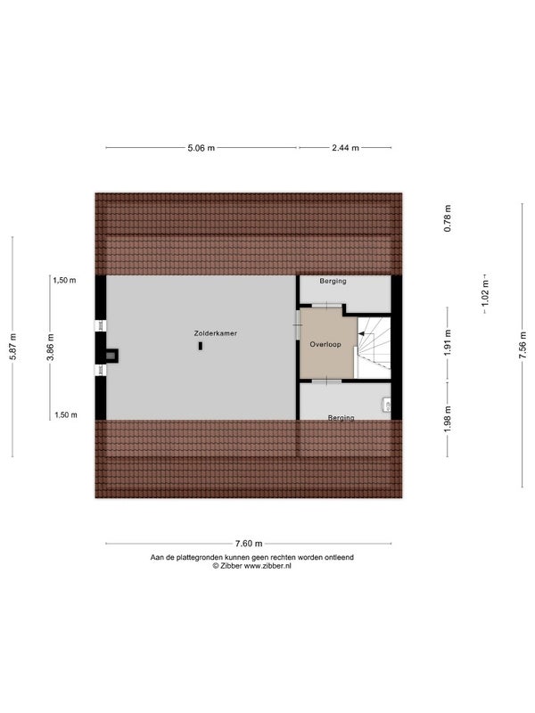 Via de vaste trap bereik je de overloop met aan weerszijden bergruimte en de toegang tot de zolderkamer.