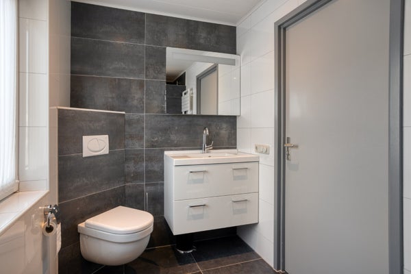 De keurige, moderne badkamer (ca. 3 jaar geleden gerenoveerd) beschikt over een douche, toilet en wastafel.