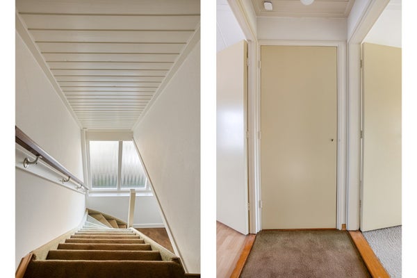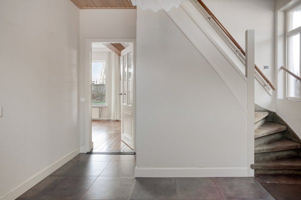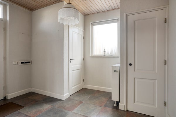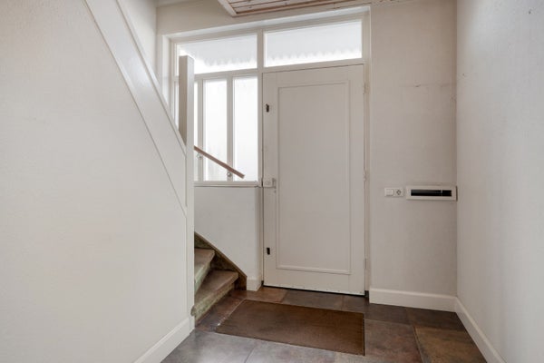 De ingang is aan de zijkant van de woning en brengt je in de hal met toilet, meterkast en trapopgang naar de eerste verdieping.
