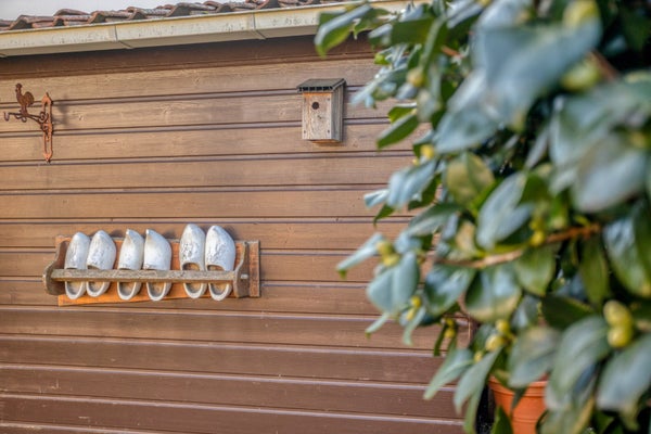 Buitenberging met overkapping voor bijvoorbeeld het tuingereedschap.