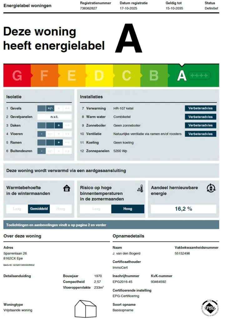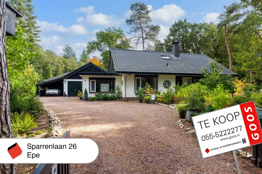 In een van de mooiste lanen van Epe staat dit ruime, levensloopbestendig familiehuis. Het is een energiezuinige semi-bungalow met een garage, grote carport en berging, gelegen op een perceel van 1750 m² en met een woonoppervlakte van 221 m². De begane grond heeft een royale hal, een lichte woonkamer met panoramisch uitzicht over de tuin, een slaapkamer en een bijkeuken. De eerste verdieping biedt twee ruime slaapkamers en een badkamer. De keuken is voorzien van inbouwapparatuur. De verwarmde garage heeft openslaande deuren en boven de garage bevindt zich een grote zolder. De woning is in 2023 volledig gemoderniseerd en is uitgerust met 13 zonnepanelen. De prachtig aangelegde tuin biedt volop groen en is gelegen dicht bij het bos en fietspaden.
