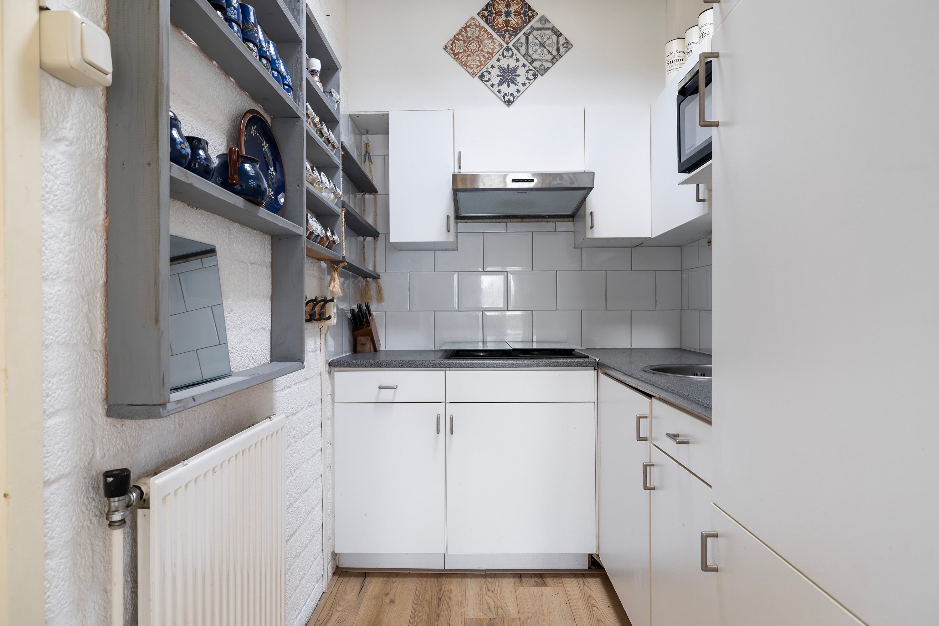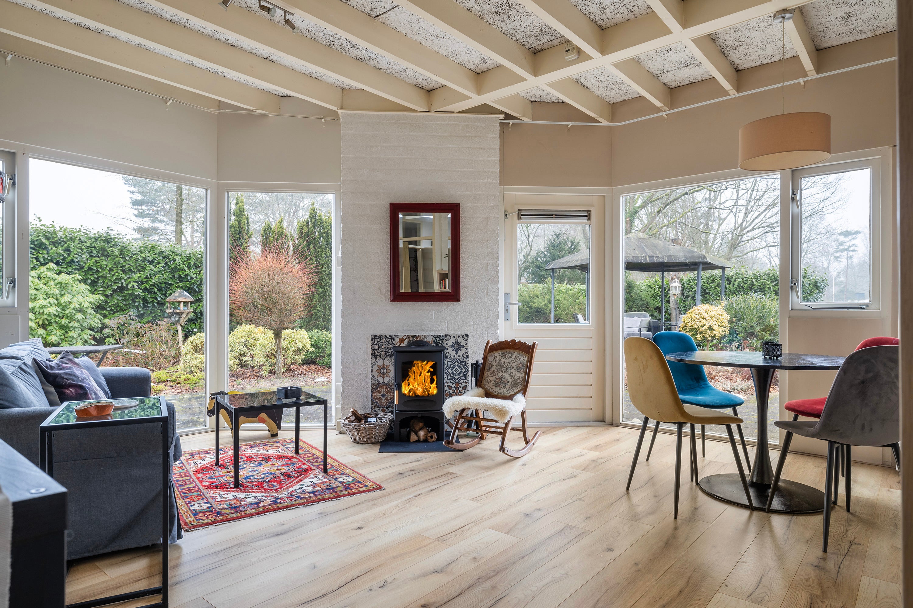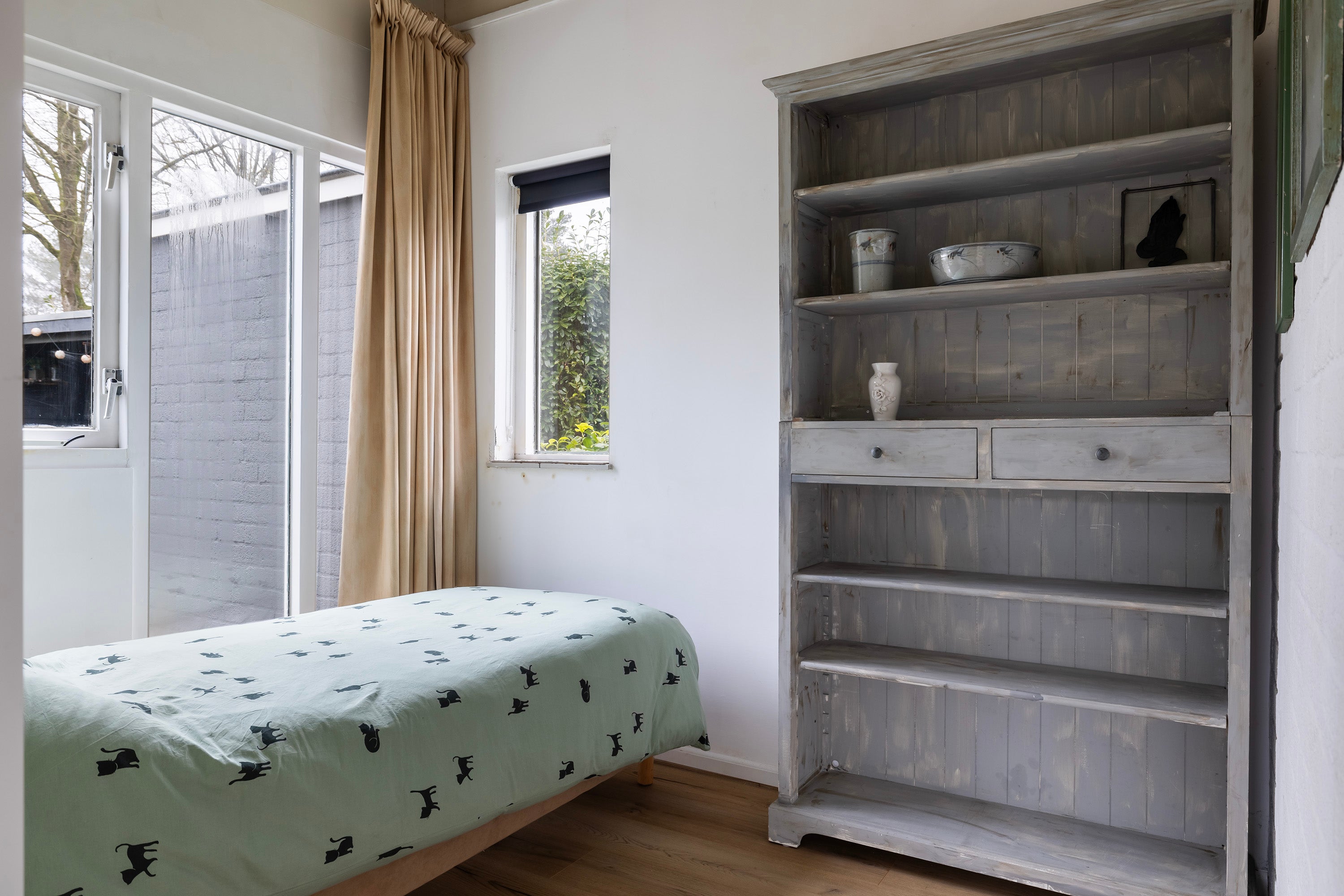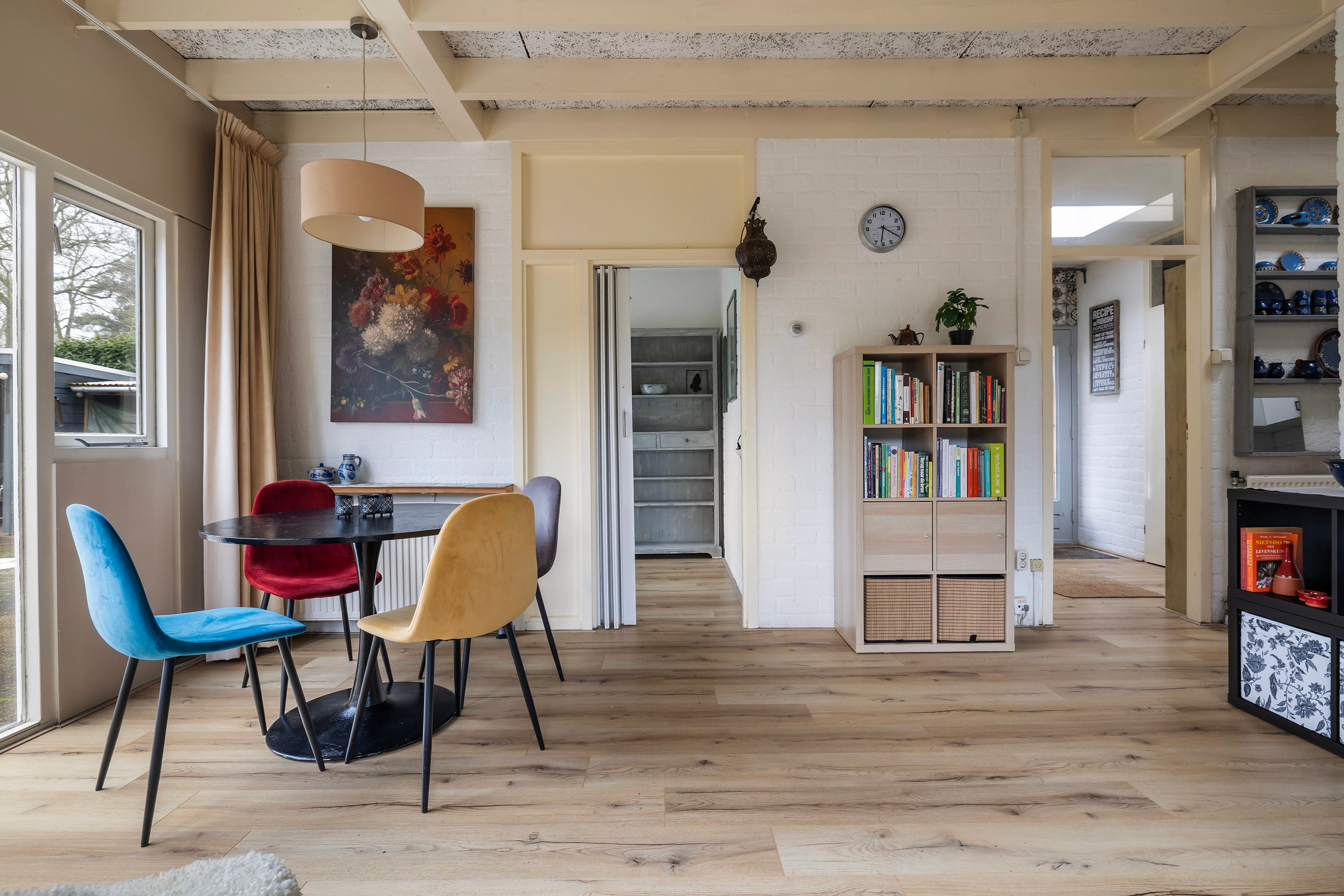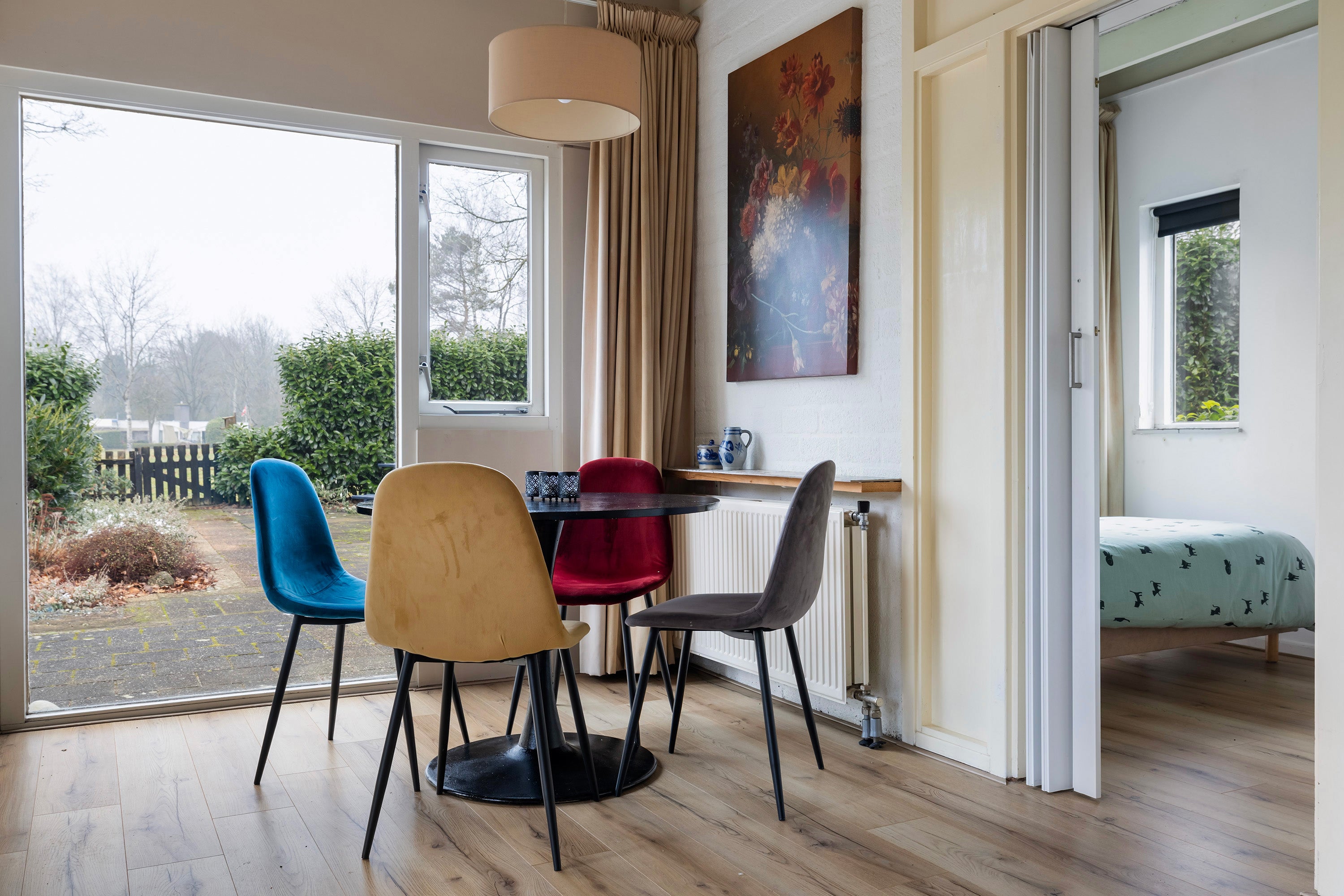 De woning heeft een lichte hal die toegang biedt tot de slaapkamer, badkamer en een halfopen keuken, uitgerust met inbouwapparatuur. De woonkamer, voorzien van een houtkachel, ligt naast de eetruimte en biedt uitzicht op de fraai aangelegde tuin met meerdere zitplaatsen. De twee slaapkamers zijn licht en praktisch ingericht, met inbouwkasten.