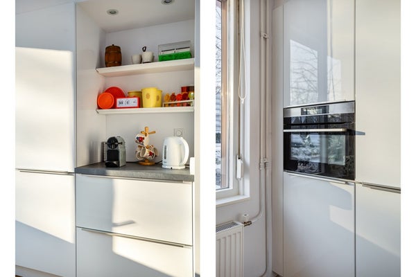 Open keuken aan de voorzijde van de woning met een leuk uitzicht over de straat. Zo kun je de visite al aanzien komen tijdens het kokkerellen. De keuken heeft een doordachte opstelling met een apparatenwand en koffie-nis. Aan het kunststofwerkblad met enkele spoelbak is er veel werkruimte voor het bereiden van de maaltijden.