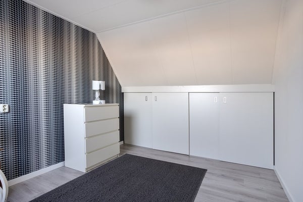 Super leuke slaapkamer met een royaal dakraam waar het daglicht goed binnen kan stromen. Het zal nog lastig kiezen worden wie deze kamer in gebruik zal gaan nemen. Menig tiener zal wel raad weten met deze kamer. Een bed, kledingkast en bureau passen er met gemak in. Achter de knieschotten kan het nodige worden opgeborgen.