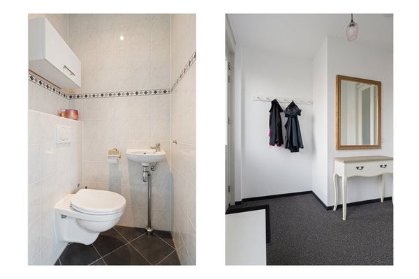 Achter de voordeur komen we in de ruime hal, met hier ruimte voor de jassen, het toilet, voorzien van fonteintje, en de trapopgang naar boven.