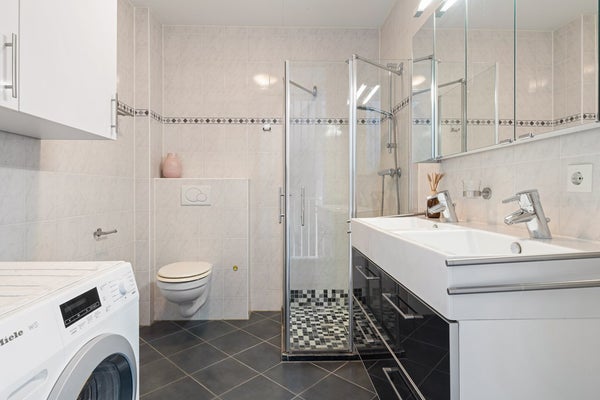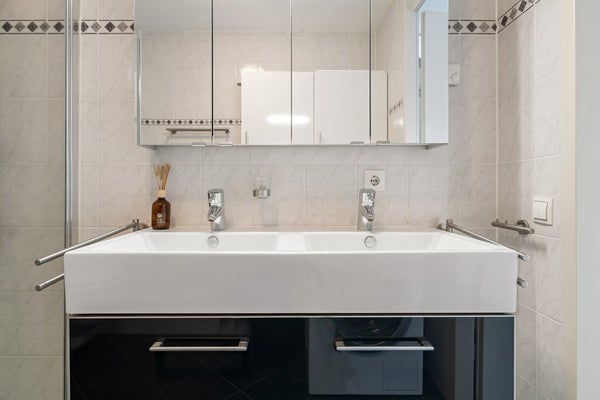 De badkamer is volledig betegeld, voorzien van een dubbele wastafel, inloopdouche, tweede toilet én een wasmachineaansluiting.