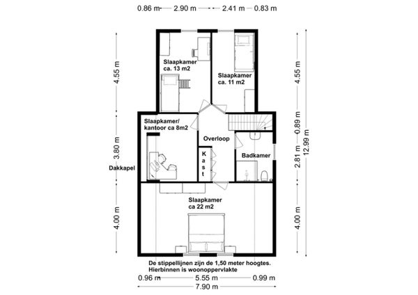 - De vrijstaande woning heeft een woonoppervlakte van 155 m² en beschikt over 7 kamers, waarvan 5 slaapkamers;