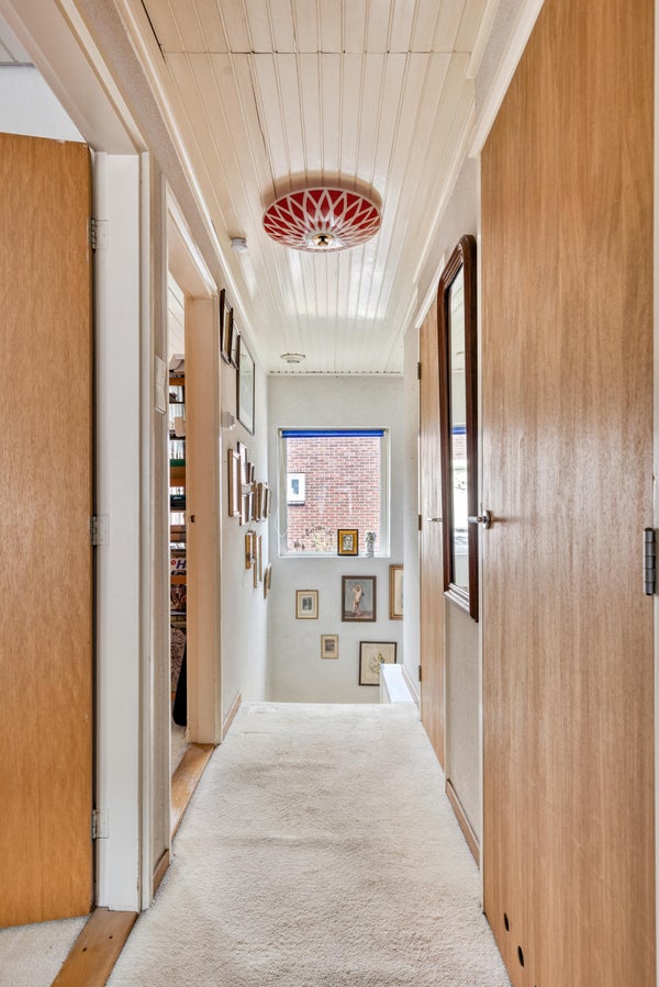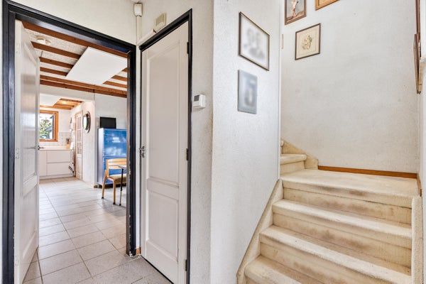 BINNENKIJKEN Als we stapvoets aan komen rijden door de charmante straat kijken we met een glimlach naar de leuke verscheidenheid aan woningen. De buurman zwaait vriendelijk, een klein gebaar dat precies weergeeft hoe het er hieraan toegaat: Een betrokken sfeer waar men naar elkaar omziet. De oprit is ruim genoeg voor twee auto’s waarbij er één onder de carport staat en de laadpaal tot z’n beschikking heeft. Normaal loop je hier volgens goed gebruik achterom maar deze eerste keer nemen we officieel de voordeur. In de hal treffen we rechts de trapopgang naar de verdieping, die is voor straks. Eerst nemen we een kijkje in de riante kelder met stahoogte. Dit is volwaardige provisie- en opslagruimte waar je veel plezier aan gaat beleven. Hier treffen we ook de compleet vernieuwde meterkast met ruim voldoende groepen.