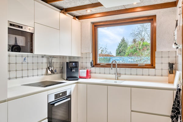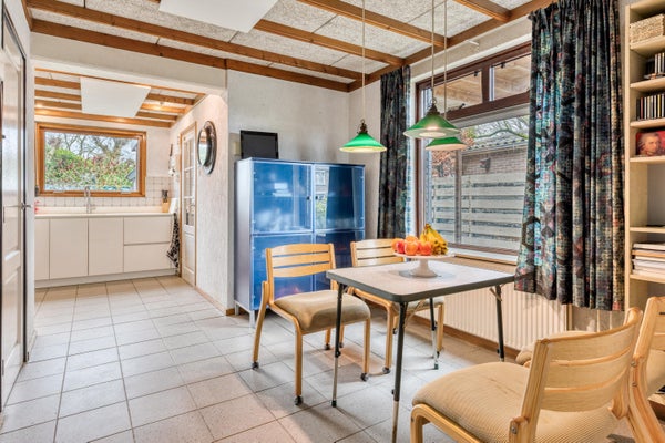 Rechtdoor lopen we de gesloten woonkeuken binnen. Een fijne, praktische ruimte met volop plaats voor een eettafel en uitzicht op de achtertuin. De keuken is voorzien van alle benodigde apparatuur en biedt een prettige indeling met voldoende werk- en bergruimte. Om de hoek bekijken we de achteringang waar onder andere de elektrische boiler is geplaatst en het gastentoilet te vinden is.