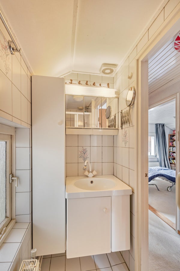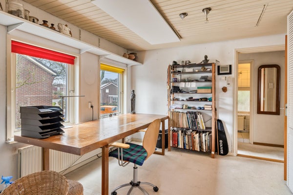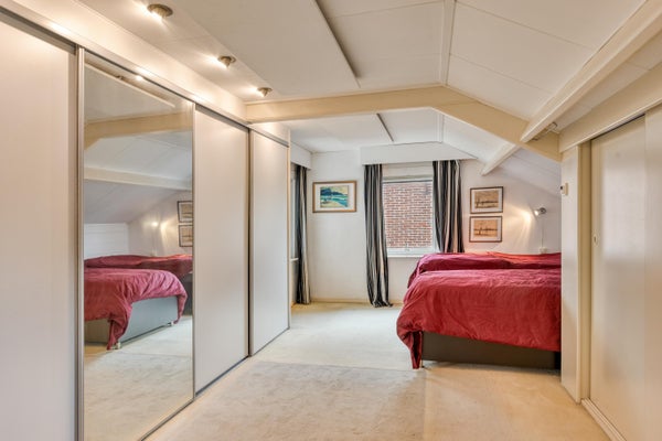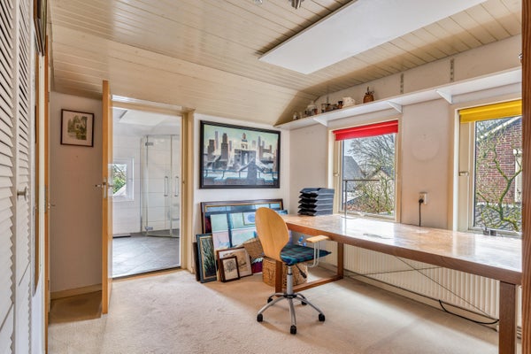 BOVEN VERDER Ook de verdieping is verrassend ruim en veelzijdig door de in totaal vier slaapkamers. Stuk voor stuk zijn het volwaardige kamers die je flexibel kunt indelen als slaap-, werk- of hobbykamer. Ideaal voor een gezin, maar ook perfect voor wie thuiswerkt en extra ruimte nodig heeft. De eerste kleinere badkamer en het naastgelegen toilet treffen we op de overloop. De tweede badkamer in de aanbouw is heerlijk ruim opgezet en voorzien van een douchehoek, een breed wastafelmeubel en comfortabele vloerverwarming. Een nette en praktische ruimte waar je de dag ontspannen kan beginnen. De zolder is bereikbaar via een vlizotrap en biedt volop extra bergruimte voor seizoensspullen, archief en meer van die zaken.