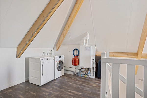 Hier bevindt zich ook de CV-installatie en zijn aansluitingen voor wasmachine en droger.