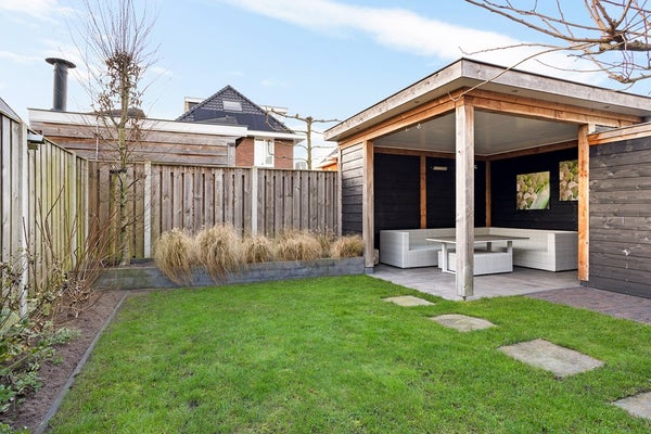 De tuin, gelegen op het zuiden, is modern afgewerkt met 2 zitjes, een overkapping met berging.