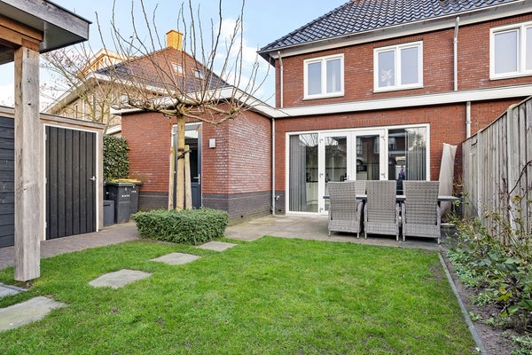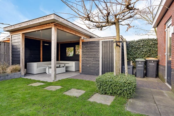 De tuin is te bereiken via de openslaande deuren in de keuken en via de berging/garage.