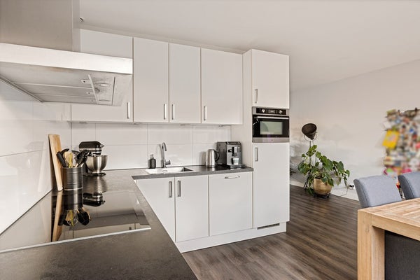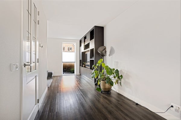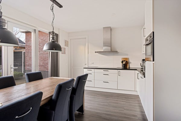 Via de ingang onder de carport stap je binnen in de entree met garderobe, trapopgang, toilet en meterkast. Vanuit de entree loop je door naar de L-vormige woonkamer met open woonkeuken. De ruimte is modern en strak afgewerkt en dankzij grote raampartijen oogt de ruimte extra ruim en licht. De keuken is modern en biedt ruimte voor een grote eettafel. Tevens is de keuken uitgerust met een afzuigkap, inductieplaat, koelkast, vaatwasser en combi-oven. Middels openslaande tuindeuren kun je de op het zuiden gelegen achtertuin betreden. Ook is er vanuit de keuken een toegang tot de bijkeuken/garage met keukenblok. Vanuit de bijkeuken is er ook toegang tot de tuin.