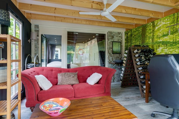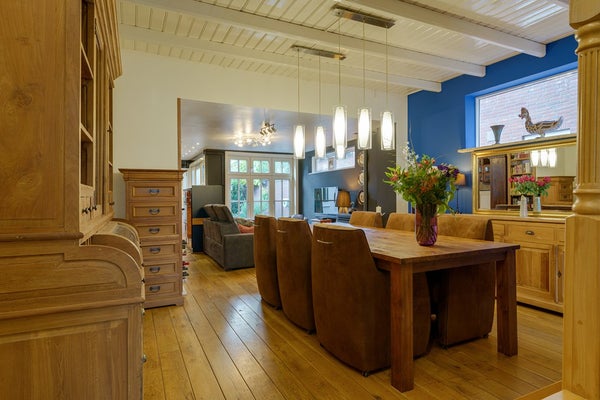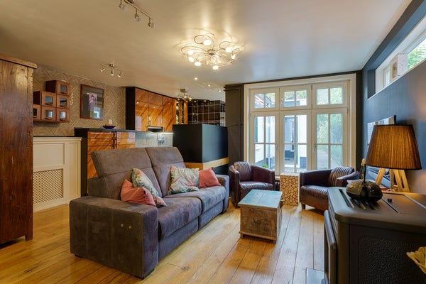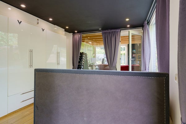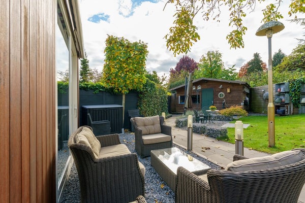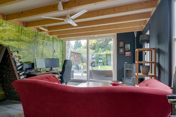 Achter deze ruimte bevindt zich een lichte tuinkamer met een schuifpui naar de tuin. Dankzij de grote raampartijen valt hier veel daglicht binnen een heerlijke plek om te ontspannen.