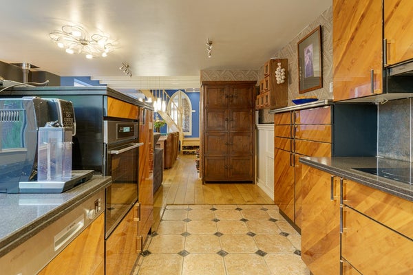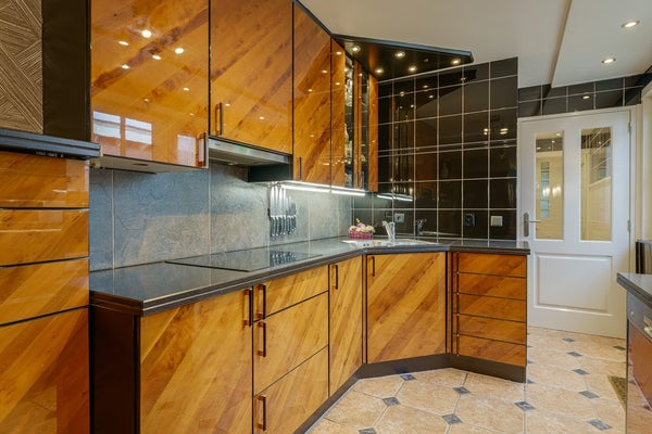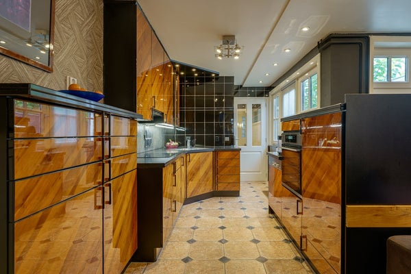 Vanuit de woonkamer loop je door naar de open keuken. De keuken is uitgerust met inbouwapparatuur, waaronder een vaatwasser, ijskast, inductiekookplaat, oven, wastafel met kraan en afzuigkap. Alles is strak afgewerkt en verkeert in uitstekende staat.