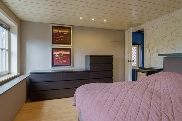 Loop je via de keuken verder, dan kom je in een tussenhal. Aan de linkerzijde van deze hal bevindt zich een badkamer en een toilet. Aan het einde van de hal ligt een praktische berging, ideaal als wasruimte of opslag. Vanuit deze berging is er toegang tot een grote slaapkamer, die ook gebruikt kan worden als werk-, hobby- of speelkamer.