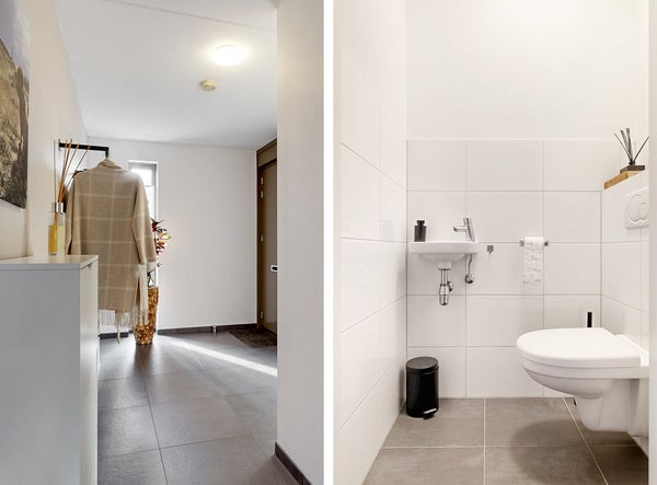 De gehele begane grond is voorzien van een grijze tegelvloer. De ruime hal geeft toegang tot de garage, toilet en de leefkeuken. De leefkeuken heeft mooi tuincontact en is voorzien van een nette keuken met koelkast, afzuigkap, vaatwasser