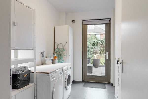 Vanuit de keuken is de functionele bijkeuken bereikbaar met aansluitingen voor de wasapparatuur en extra ruimte voor berging. De bijkeuken heeft een extra deur naar de tuin.