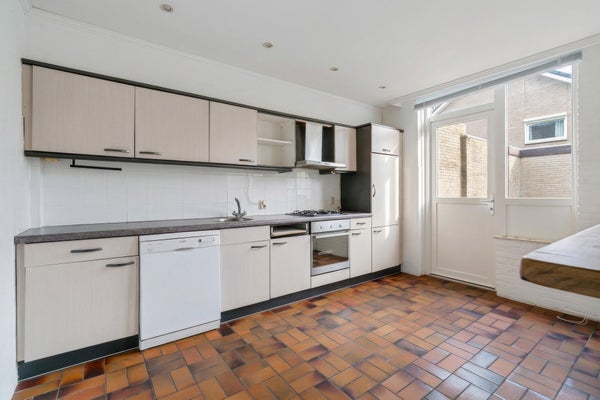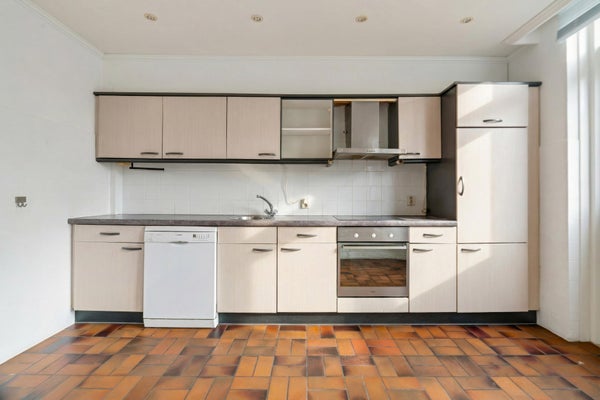 Open keuken(4.14m2.96m) sluit hier op aan en is uitgerust met inbouwapparatuur (gaskookplaat, afzuigkap en vaatwasser), met volop mogelijkheden voor modernisering naar eigen smaak.