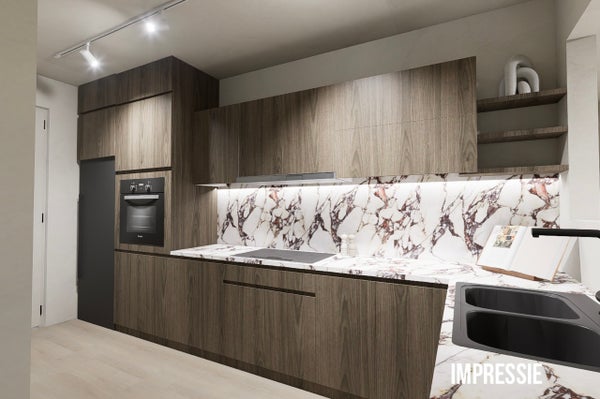 Semi-open keuken voorzien van stenen werkblad, 5-pits kooktoestel, rvs-wasemkap, koelkast, oven, magnetron en vaatwasser.