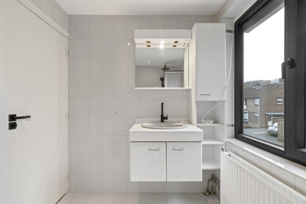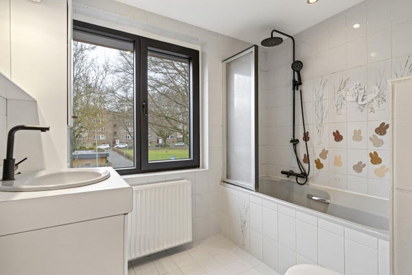 De volledig betegelde badkamer is voorzien van een ligbad met douche, toilet en wastafelmeubel en is praktisch ingericht voor dagelijks gebruik.
