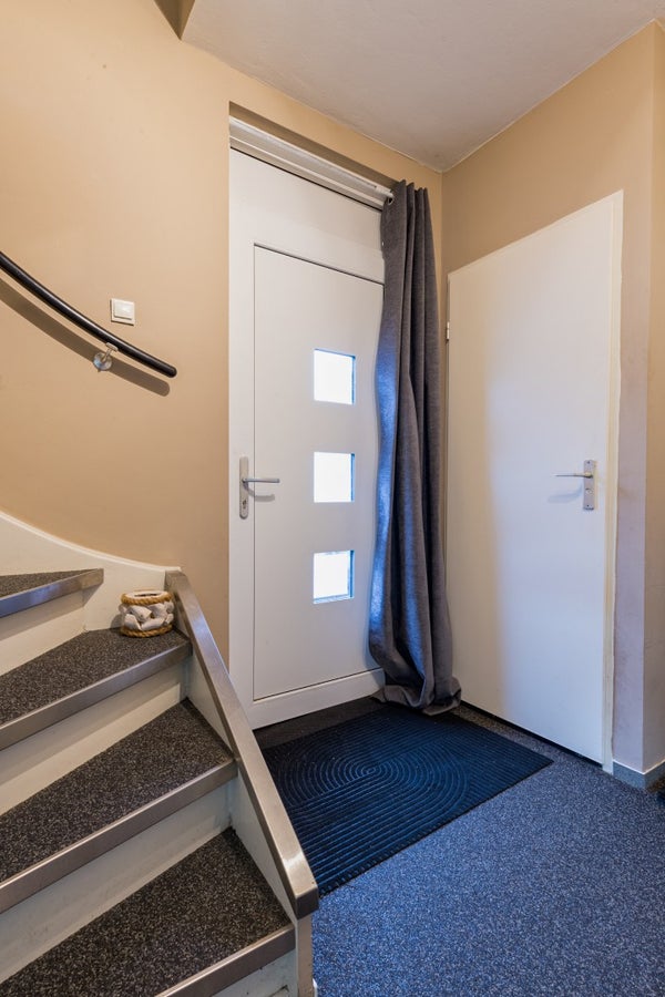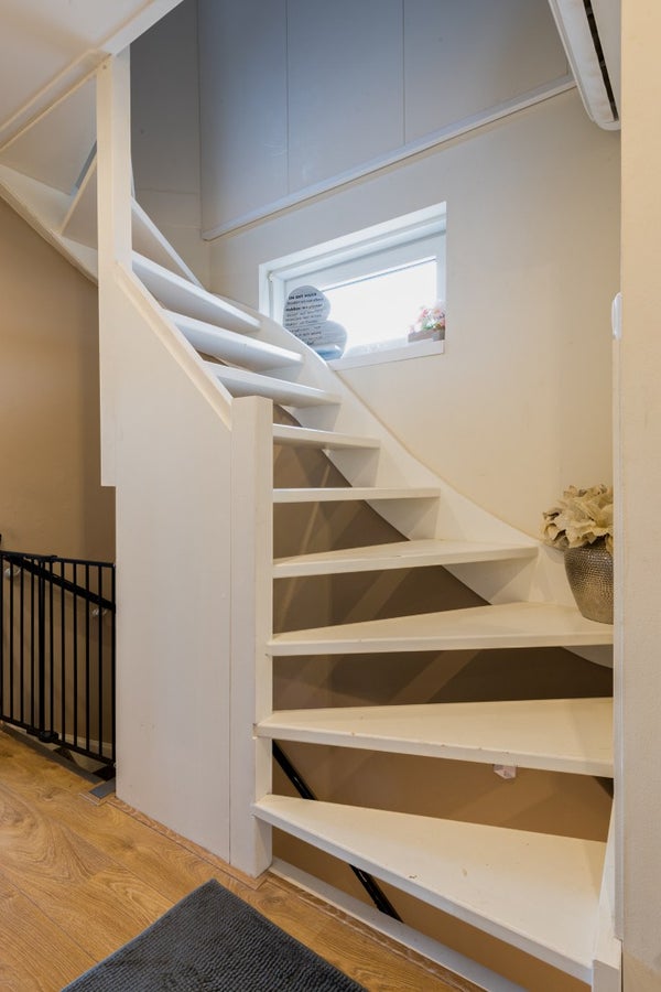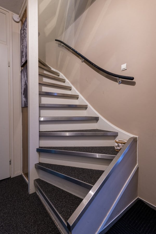 Vanuit de ontvangsthal is de bovenverdieping middels de trap bereikbaar.