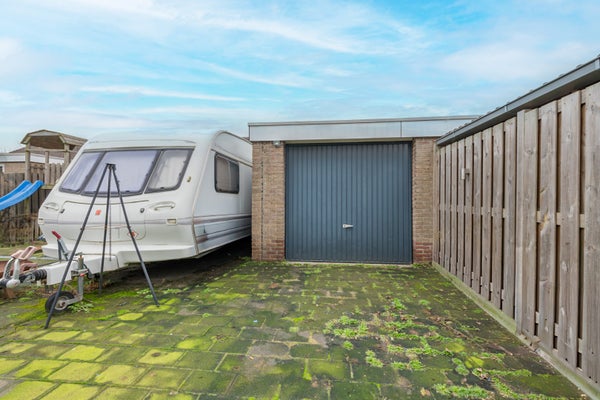 De ruime achtertuin is geheel beklinkerd en daardoor zo goed als onderhoudsvrij en is bereikbaar middels een eigen achterom. De garage, gelegen in de achtertuin heeft ruimte voor 1 auto.