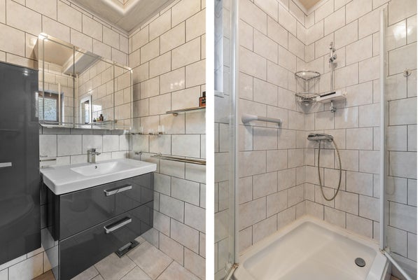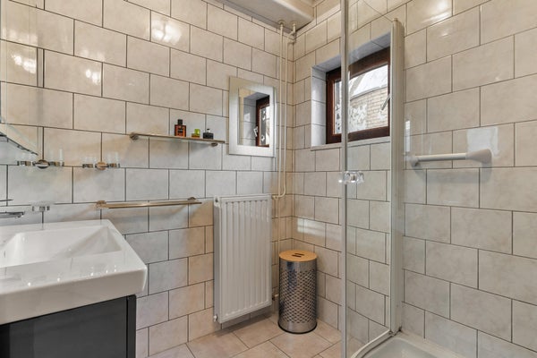 Volledig betegelde badkamer(2.87mx1.85mx1.09m) met douche, badmeubel, opstelplaats c.v. - ketel (eigendom).