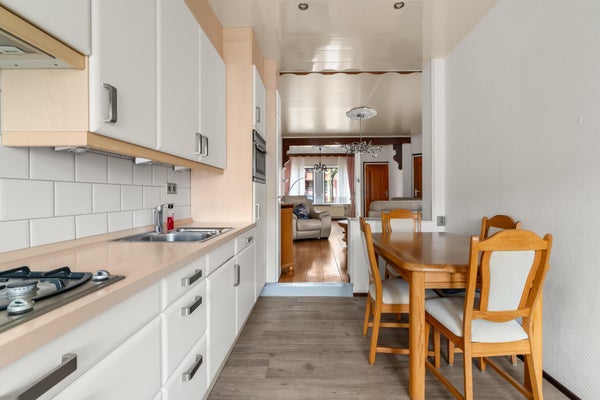 Open keuken (3.46 x 2.35) (aanbouw) met aanbouwkeuken inclusief apparatuur w.o : gasfornuis, afzuigkap en koelkast, deur naar terras.