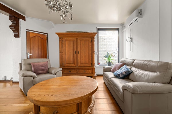 Woonkamer(6.11mx4.16m) met parketvloer en airco.