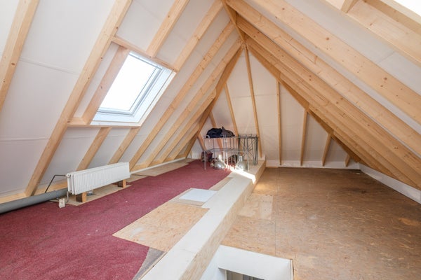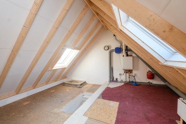 Riante zolderruimte met twee dakramen en opstelling van de cv-ketel. Hier is eenvoudig een extra slaapkamer te realiseren.