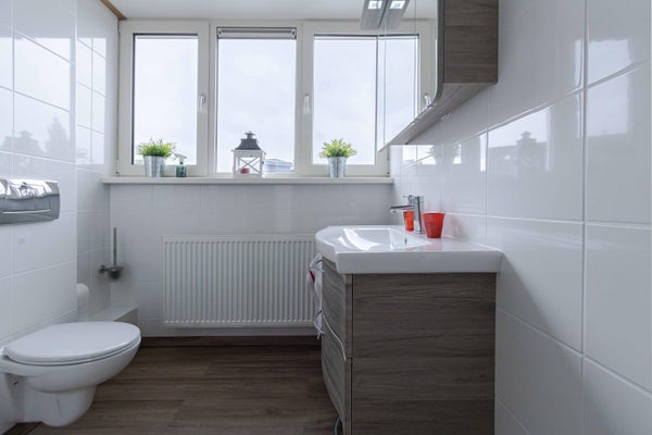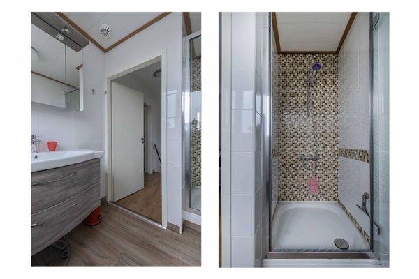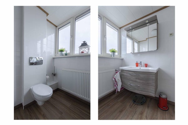 Overloop, slaapkamer I (ca. 18 m2) met laminaatvloer en vaste kast, slaapkamer II (ca. 16 m2) met laminaatvloer en vaste kast, moderne badkamer (ca. 6 m2) v.v. douchecabine, wandcloset, wastafelmeubel en spiegelkast.