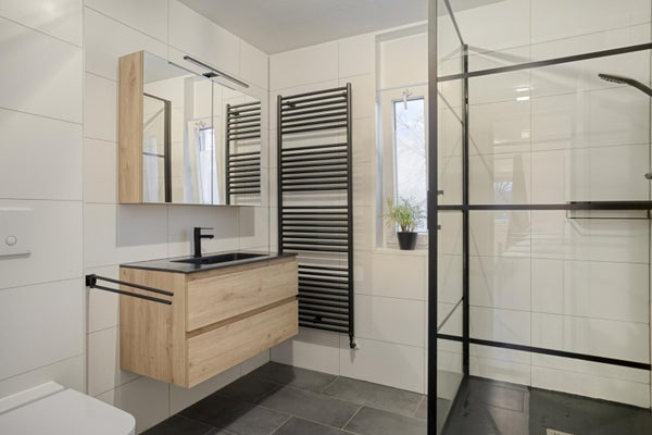 De badkamer is modern en stijlvol afgewerkt met grote witte wandtegels en antracietkleurige vloertegels. Het houten wastafelmeubel, de kolomkast en de glazen douchewand met zwart profiel geven de ruimte een luxe uitstraling. De badkamer beschikt over een inloopdouche, wastafelmeubel met spiegelkast en een hangend toilet.
