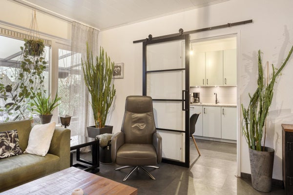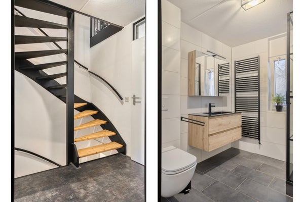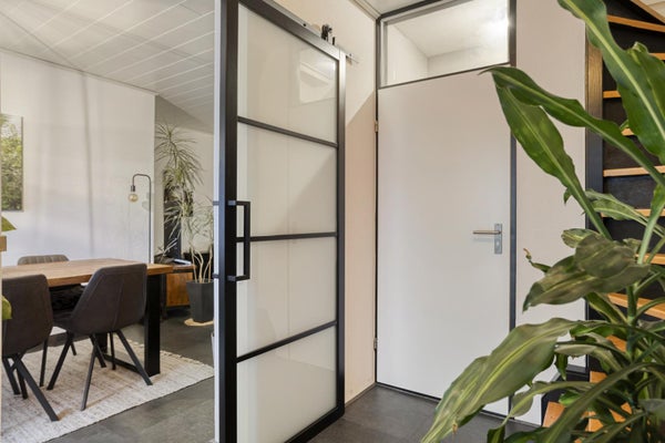 Bij binnenkomst valt direct de lichte hal op, met een stijlvolle schuifdeur naar de woonkamer. Hier bevinden zich ook het toilet, de meterkast en de trap naar boven. De woonkamer is opvallend licht en sfeervol, met strakke wanden en een moderne vloerafwerking. De zwarte schuifdeuren naar de hal en de keuken geven de ruimte een eigentijdse uitstraling en zorgen voor een mooie verbinding tussen de leefruimtes.