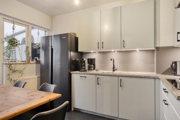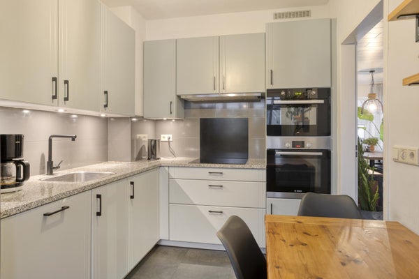 De keuken is praktisch en compleet ingericht met een granieten aanrechtblad en diverse inbouwapparatuur, waaronder een vaatwasser, combimagnetron, heteluchtoven, koel-vriescombinatie, afzuigkap en inductiekookplaat. Vanuit de keuken stap je zo de serre in. Een heerlijke extra leefruimte waar je, dankzij de glazen schuifwanden, ook in de winter comfortabel kunt zitten met een terrasverwarmer aan.