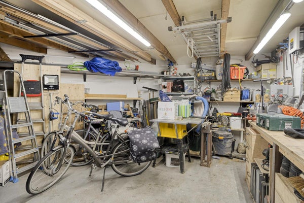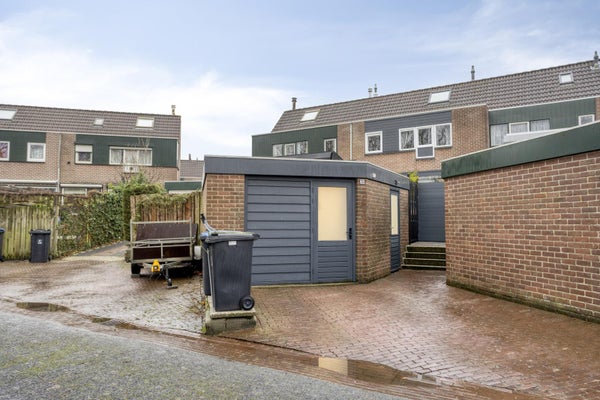 De garage is bereikbaar via de achtergelegen straat en biedt parkeergelegenheid op eigen terrein. De voormalige garagedeur is vervangen door een loopdeur, wat het gebruik met de fiets bijzonder praktisch maakt.