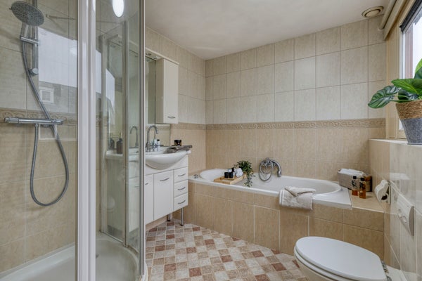 De badkamer bevindt zich aan de voorzijde van het pand en is ingericht met een los ligbad, een inloopdouche, een toilet en een wastafel.