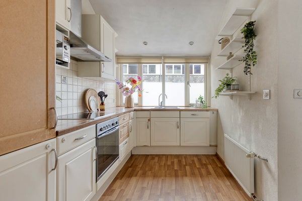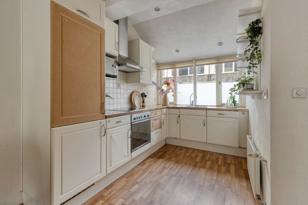 De keuken is gesitueerd aan de voorzijde van de woning en is uitgevoerd in een praktische opstelling met onder- en bovenkasten. De keuken is voorzien van de volgende inbouwapparatuur: koelkast, vriezer, oven, magnetron, gaskookplaat, afzuigkap, vaatwasser en een kraan met spoelbak.