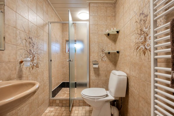 Eenvoudige badkamer, betegeld, met douchecabine, wastafel, toilet.