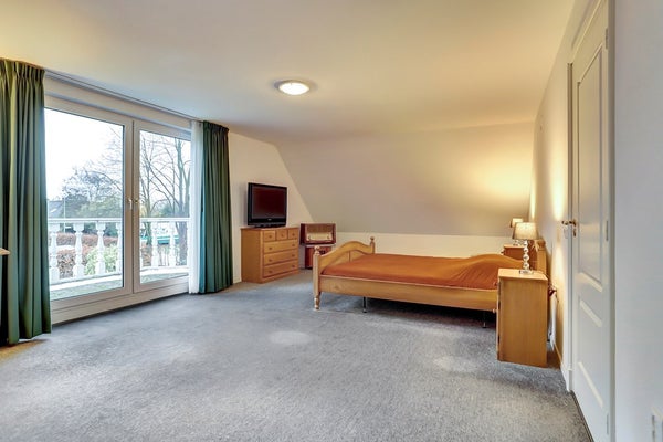 De grootste slaapkamer is echt een parel. Deze kamer strekt zich uit over de volledige diepte van de woning en voelt daardoor aan als een suite. De openslaande deuren geven toegang tot een balkon vanwaar je uitkijkt over de tuin en het achterliggende bos. ’s Ochtends wakker worden met dit uitzicht, rustiger kan bijna niet. Als extra is er een praktische inloopkast, subtiel weggewerkt achter een wandje. Alles netjes uit het zicht maar toch direct bij de hand.