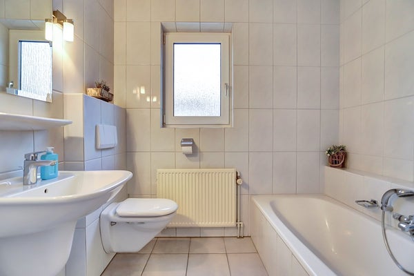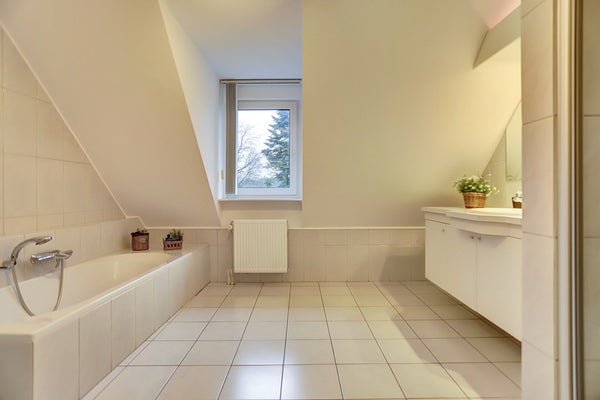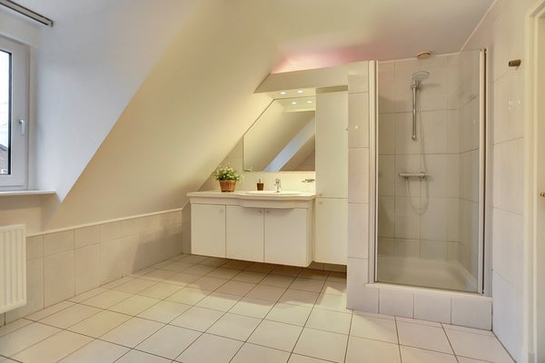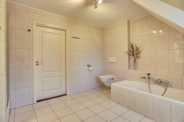 Op deze verdieping ligt ook nog een royale tweede badkamer die echt uitnodigt om te ontspannen. Hier vind je een heerlijk ligbad, een aparte douchecabine, een wastafel met meubel en ingebouwde spotjes en een wandtoilet. De badkamer is uitgevoerd in lichte, neutrale kleuren waardoor hij tijdloos oogt en eenvoudig te combineren is met elke stijl. Dankzij de vloerverwarming is het er altijd behaaglijk en via de dakkapel met draaikiepraam komt er volop daglicht naar binnen en heb je de mogelijkheid om lekker te ventileren.