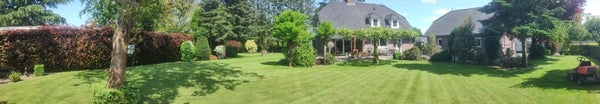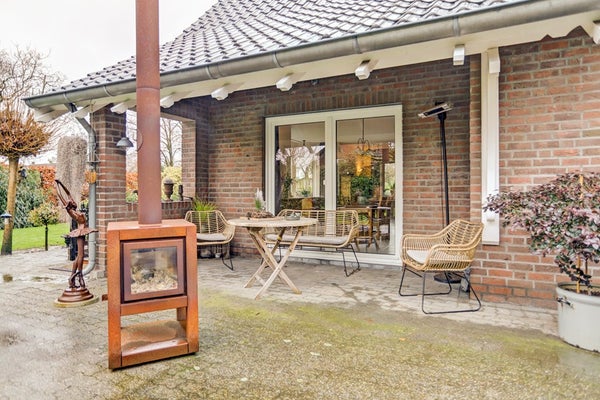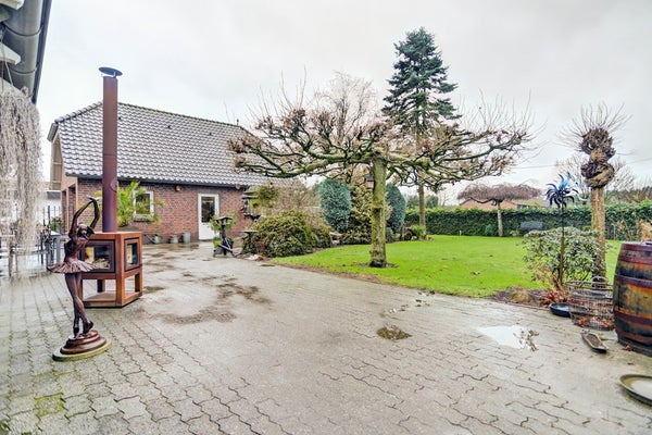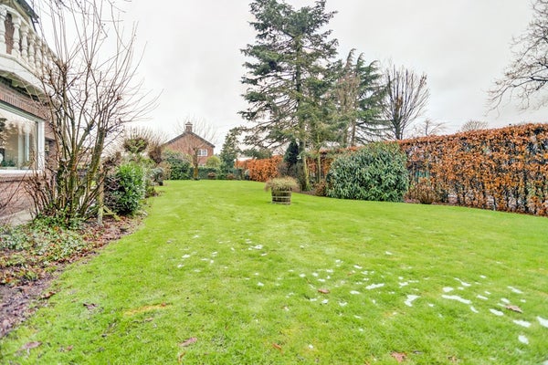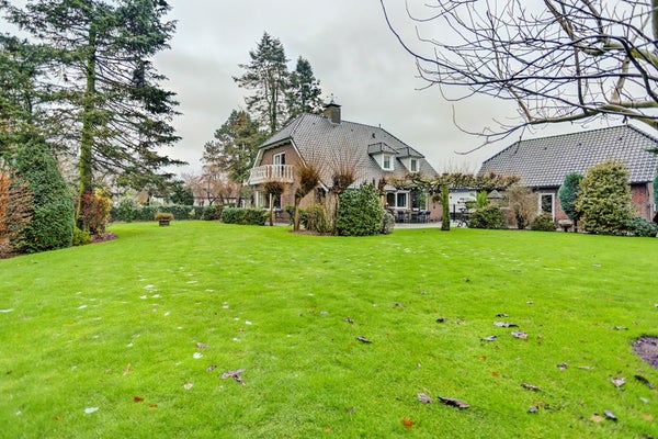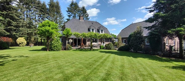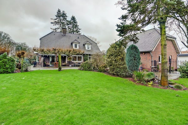 Niet alleen binnen is er een overvloed aan ruimte want buiten gaat het genieten gewoon verder. De tuin loopt rondom de woning en oogt het hele jaar door prachtig groen. Het ruime gazon, de statige dakplataan waar je op warme zomerdagen heerlijk beschut onder kunt zitten, de sfeervolle notenboom en de kleurrijke borders met planten en bloemen zorgen samen voor een parkachtige uitstraling. De groenblijvende heggen vormen een natuurlijke en mooie afscheiding van het perceel waardoor je ook volop privacy ervaart. Direct bij de openslaande deuren van de woonkamer ligt een overdekt terras: de plek voor lange zomeravonden, diners buiten en ontspannen koffiemomenten. Verder verspreid door de tuin ontdek je nog meer knusse zitplekjes, of creëer je ze zelf, steeds weer met een ander uitzicht.