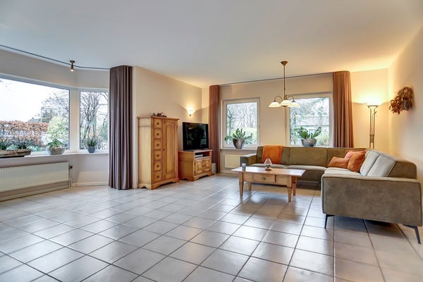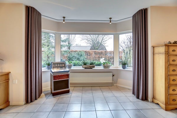Vanuit de keuken loop je moeiteloos naar de royale woonkamer die zich uitstrekt over de volledige diepte van de woning. Grote ramen aan de voorzijde, een sfeervolle erker en openslaande deuren naar het terras laten het daglicht rijk naar binnen stromen. Dit is zo’n woonkamer waar je direct ziet hoe je leeft: een gezellige zithoek bij de ramen, misschien een speelhoek, een leesplek of een grote familietafel. Er is ruimte genoeg om het helemaal naar je hand te zetten.