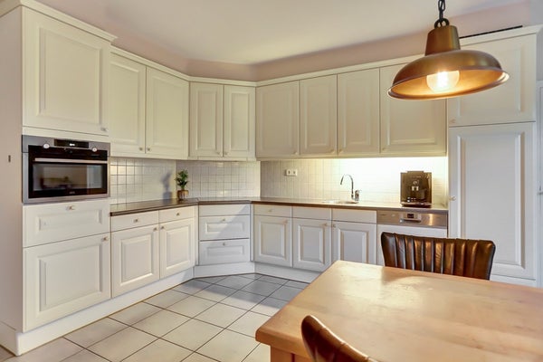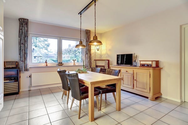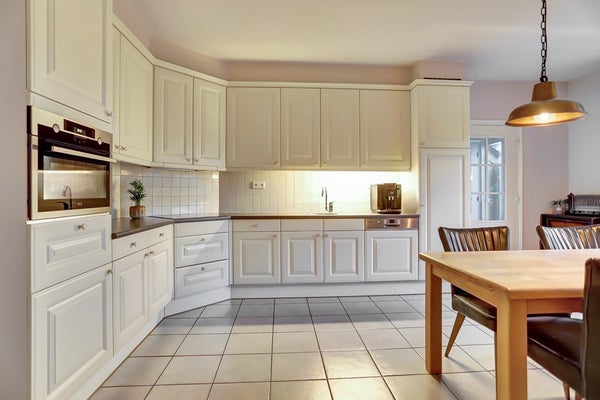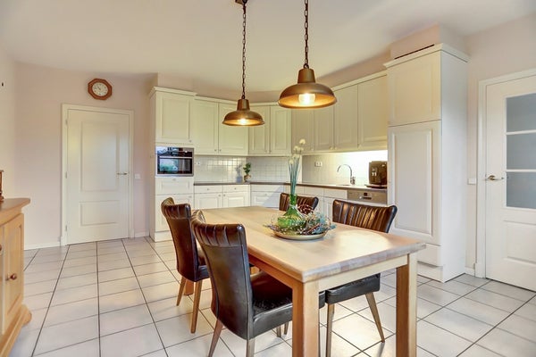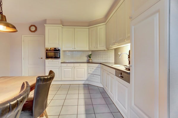 Rechtdoor voert de route je de keuken in: warm, uitnodigend en tijdloos. Ondanks haar leeftijd oogt deze keuken nog altijd verzorgd en stijlvol. De combinatie van lichte hardhouten kastjes met het donkere kunststof aanrechtblad geeft een rustige, tijdloze uitstraling. Hier kook je op een vierpits inductieplaat, gebruik je de combi-oven voor snelle maaltijden en staan vaatwasser en koelkast al klaar om het dagelijks leven makkelijker te maken. De vele kastjes zorgen voor veel bergruimte. Aan de eettafel, die hier moeiteloos een prominente plek krijgt, geniet je van het uitzicht over de achtertuin. Door het grote raam met elektrisch te bedienen zonnescreen zit je hier comfortabel, in elk seizoen.