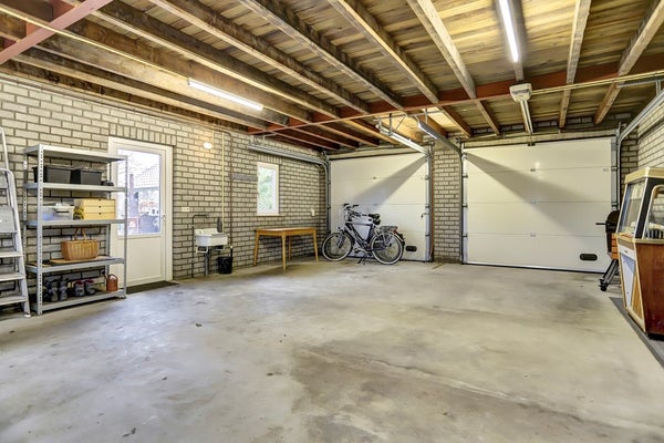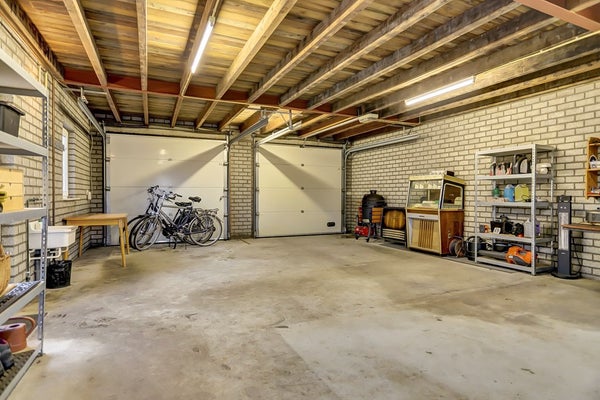 In de tuin staat bovendien een grote, dubbele garage met twee rolpoorten, waarvan één elektrisch bedienbaar. Hier kun je moeiteloos meerdere auto’s of machines plaatsen. De garage beschikt over een werkplaats met krachtstroom en verwarming zodat je er het hele jaar door comfortabel kunt klussen. De garage is volledig geïsoleerd (met uitzondering van de vloer) en via een ladder bereik je de praktische zolderverdieping, ideaal voor spullen die je niet dagelijks nodig hebt. Voor de garage ligt een ruime oprit met plek voor meerdere auto’s en zelfs voor een caravan of camper.